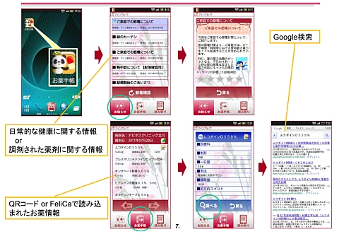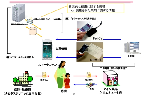 アインファーマシーズとNTTドコモは2011年7月から3カ月間にわたり,スマートフォンを利用した電子お薬手帳の実証実験を行いました。薬歴システム・レセコンからスマートフォンに情報を送る仕組みは三洋電機の協力を得ました。