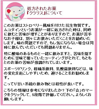 たとえば,ドライシロップ剤が投薬された患者には,飲み方に関する注意事項などが,送られたほか,一部は剤形別ではなく個別の薬剤について,とくに注意喚起するメッセージも送られました。クラリス・クラシッドでは苦味の出る飲み物で服用しないよう注意喚起するメッセージなどです。
